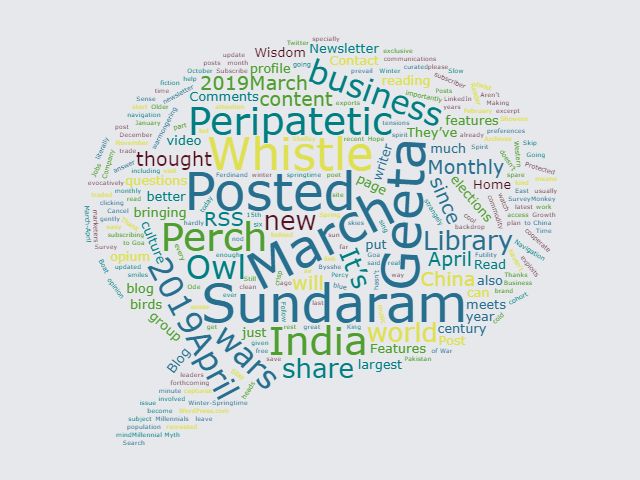 Then, just for a lark, I generated a word cloud for the blog site. And even though I am somewhat embarrassed that my name has appeared in such large letters (since it hardly appears on the site!), I thought I would share it nevertheless. At least the site name, the name of the newsletter, and words like owl wisdom, thought, India, China and the world, as well as business and culture seem to have registered well. I am puzzled that the word economy is not prominent, since I tend to use it often in the blog (perhaps, a little too often!).
