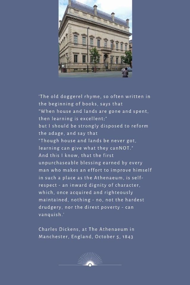 Below is a quote from a speech that Charles Dickens gave at a soiree at the Manchester Athenaeum in 1843, where others who spoke on the occasion were Richard Cobden and Benjamin Disraeli. It was a society for the “advancement and diffusion of knowledge”.