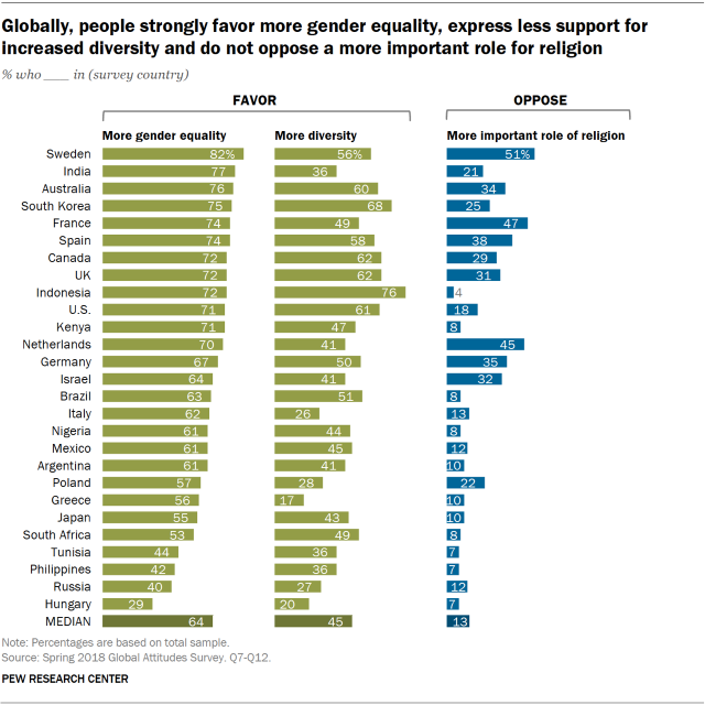 On the questions of gender parity, immigration and religion, I also looked up Pew Research Center’s Spring 2018 Global Attitudes Survey and the findings seem to suggest that broadly speaking, across 27 countries surveyed, people feel that diversity has increased and so has gender equality (though more men than women think so). While that is reassuring, they also feel that family ties are weakening. Overall, people in most countries think the importance of religion has grown and will not oppose it. There are outliers like Greece and Italy where people are not willing to accept greater diversity, a direct fallout I think from the immigration and refugee crisis of 2015. Hungary too is not in favour of greater diversity, part of Orban’s fight against immigration I suppose.