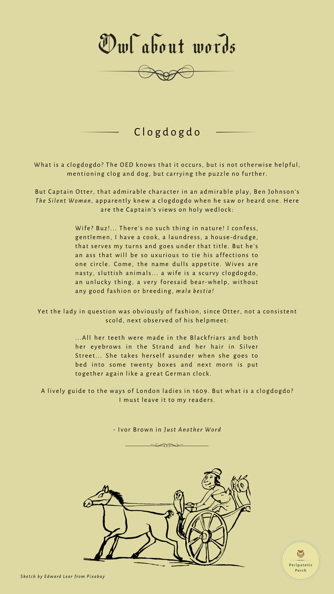 This post, for example, is about a word that Ivor Brown found while reading a play titled Epicoene or The Silent Woman, by Ben Jonson. Clogdogdo. Never heard of it? Well, here are some of Ivor’s thoughts on the use of the word.