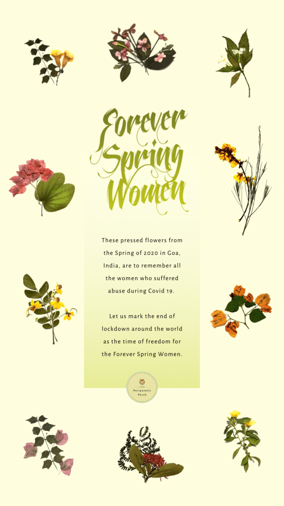 In a previous post, I had shared a poem I wrote about these women in which I used the metaphor of pressed flowers. Here, I have gathered these flowers on my walks in Goa in the Spring of 2020 – as you can see in the images below – with the idea of sharing the beauty and charm that even pressed flowers possess.