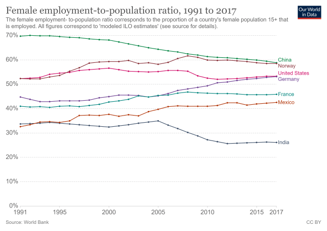 This article in The Economist reports that the women’s labour force participation rate in urban India has fallen from already low levels, to 7%, according to CMIE (Centre for Monitoring the Indian Economy) data. A couple of years ago, I remember reading that it had fallen to 17%. And it was only in 2018 that I remember reading in The Economist that the women’s labour force participation rate in India was around 26%, having already fallen from 35% in 2008. Even more baffling is the reason being attributed for the fall: middle class families that were doing better financially thought it no longer necessary for their womenfolk to work.