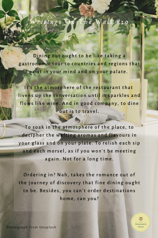 Few restaurants and hotels take the trouble to serve fine food, and the atmosphere to go with it. And since I have recently been writing on brands in the wines and spirits industry, I think there is every opportunity to look forward to the revival of fine dining soon. Let our taste buds go on a journey once again!
