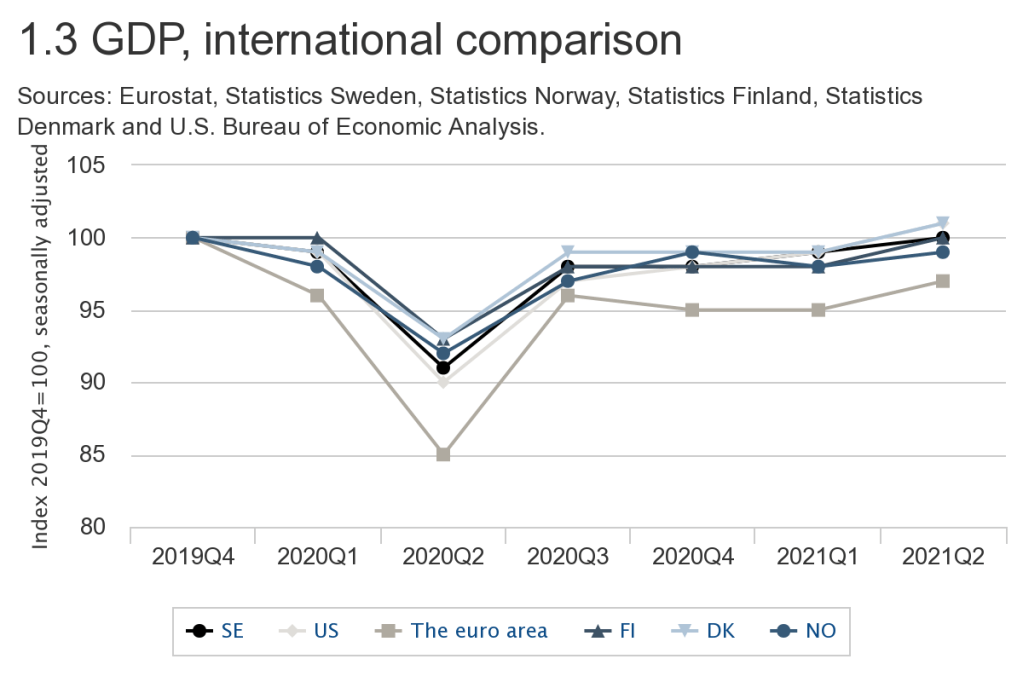 It is worth noting that even in GDP terms, most of the Scandinavian economies suffered less of a fall in economic output during 2020-21, and almost all of them were back to pre-pandemic levels in Q2 of 2021, same as the US, according to the chart below from the Government of Sweden website. Denmark seems to have done even better than the US and Norway less so, but higher than the Euro area. What’s more they seem to have managed this growth without stoking inflation to very high levels.