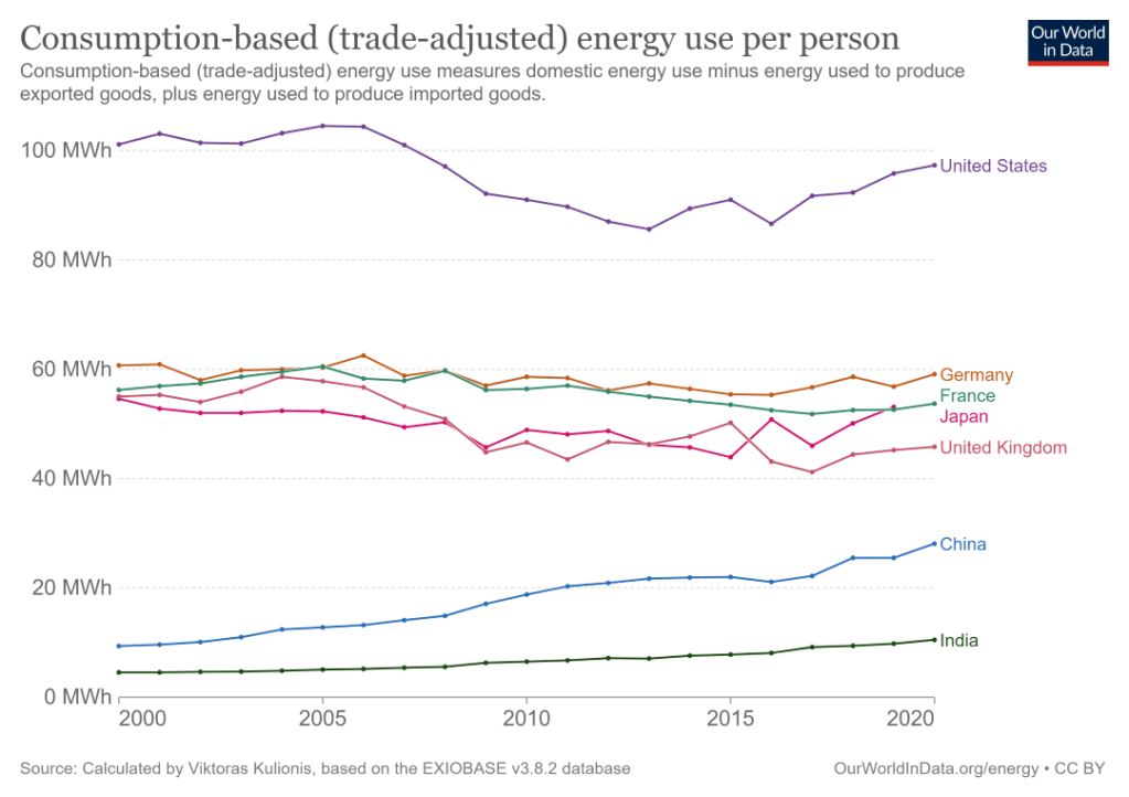 From what I saw on Our World in Data’s website, there is an attempt to measure energy intensity of economies, but it does not exactly correspond to what I am talking about here. World Bank and IEA have calculated energy intensity of countries by GDP, but that takes into account only energy on the production side. Then, there is an attempt to measure energy intensity of consumption, per person based on what the country exports and imports. And finally, there is data on fossil fuel consumption growth, which has only increased or stayed steady over time. And that is what we are talking about here, aren’t we? While the US leads annual fossil fuel consumption growth, China and India are quite high up there as well. These are not good signs for our environment and for our energy security as well.