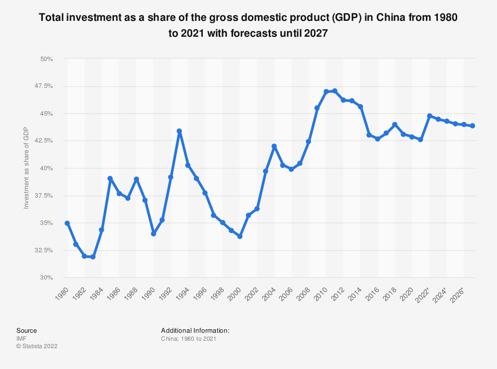 Has infrastructure spending been able to come to the rescue of China? Not that strongly, it appears from the fixed asset investment during the first 10 months of 2022. It grew by 5.3% when estimates suggested a 5.6% growth. However, it is still growth. One must look at fixed asset investment as a percent of GDP and whether that number has grown. According to Statista which cites the IMF World Economic Outlook Report October 2022, China’s fixed asset investment for 2022 was 44.77% of GDP, which has grown from the previous year. With investment that large as a proportion of GDP, it would be fair to say that 5.3% growth on such a large base is indeed good growth. I think that with the housing sector in massive decline, the country has still done reasonably well to grow its investment.