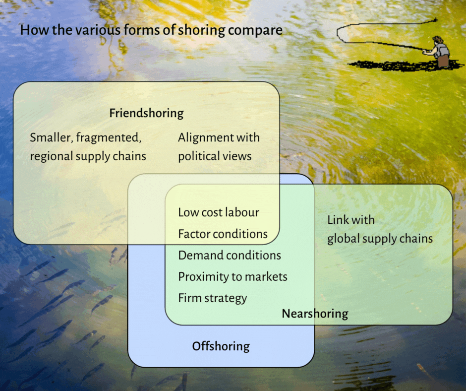 I tried analysing the features of each type of shoring and seeing how and in what ways they differ from each other. And indeed, if each was superior to the other, and if so, in what ways. I find that the most basic and fundamental form of offshoring corresponds to Porter’s diamond the most; its features map all the four dimensions of factor conditions, firm strategy, structure and rivalry, demand conditions and related industries/services. Most multinational companies will consider offshoring manufacturing or a part of it, if it meets the criteria of factor conditions, demand conditions, firm strategy at the very least. If related industries are already existent, or if their offshoring spawns them, even better.