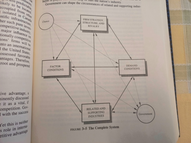 Strangely enough, Porter doesn’t mention his Five Forces Model of Competitive Advantage, which I have written about before, anywhere in this book, nor does he explain in the introduction why it makes way for the diamond theory in this context. I kept thinking about it as I was reading this book and it became apparent to me that since this book is about nations competing at an industry level, the five forces model might have been inadequate especially in dealing with things like factor conditions and demand conditions.