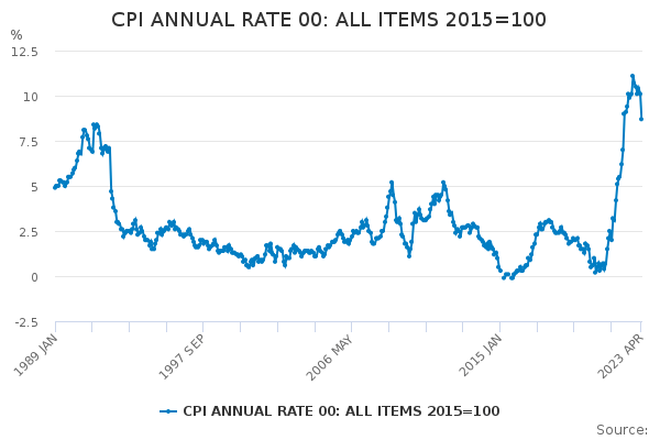 The UK managed to only eke out growth of 0.2% in the March 2023 quarter over the previous year, just enough to avoid a technical recession, and that’s where consumer price inflation is raging the highest at 8.7% in April 2023, lower than the UK highs of well over 10% in previous months, as can be seen in the chart above from the ONS (Office for National Statistics) website. What’s more, despite food prices coming down globally, UK seems to be suffering from unusually high food inflation, at over 19%. The other problem that Britain seems to be suffering from is higher wage increases, and the Bank of England has warned that this is leading to a wage-price spiral, making its job of tackling inflation more arduous. I wondered if both the food inflation and the high wage pressures are not being caused by Brexit, or at least being aggravated by it. I then came across an article citing a study done by LSE, pointing to Brexit indeed, as the cause of high food inflation. That wage pressures would be higher also thanks to the government striking pay increase deals with various unions in recent months is something, I had envisaged and written about.