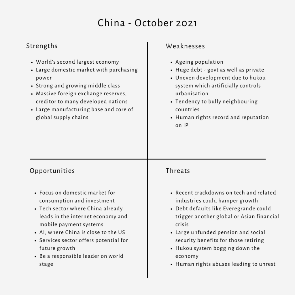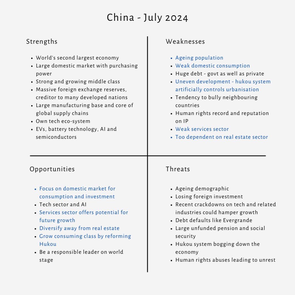 I had done a SWOT analysis of various economies and economic regions in a blog post, dated October 2021, and I thought it might make sense to revisit it. In my SWOT analysis for China then, I had said that AI and high-tech goods including EVs were opportunities. Now I find that they have become China’s strengths, in a matter of three years. Some of it is due to the rapid pace at which technology progresses, but China is also relying on its strengths and industries in which it is competitive, to boost economic growth at a time when the country is slowing down.