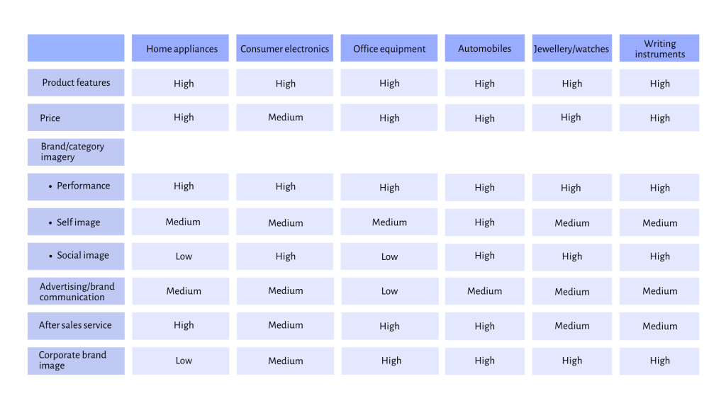 First, I have tried to create a grid/table with the main factors affecting brand choice in consumer durables, at least in India, for each of the main categories. The most important factors driving brand choice are product features, price, brand imagery – which I have further divided into performance, self-image and social image – advertising and brand communications, after-sales service and corporate brand image.