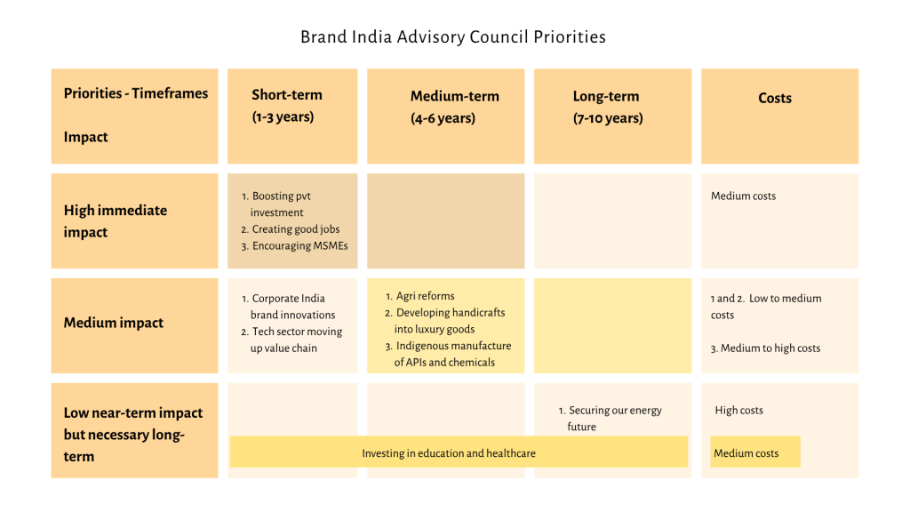 I have created a grid/table of what I think are the most important tasks and the time frames they need to be viewed within, as well as their impact on the economy. Alongside, I have also put down costs though these are only indicative and relative, depending on the specific tasks. This is just to help readers and India Inc understand how to think about the Brand India programme holistically and how to approach it. As you can see, the short-term and high-impact set of priorities are the ones to get started on first, before addressing the medium and long-term issues.