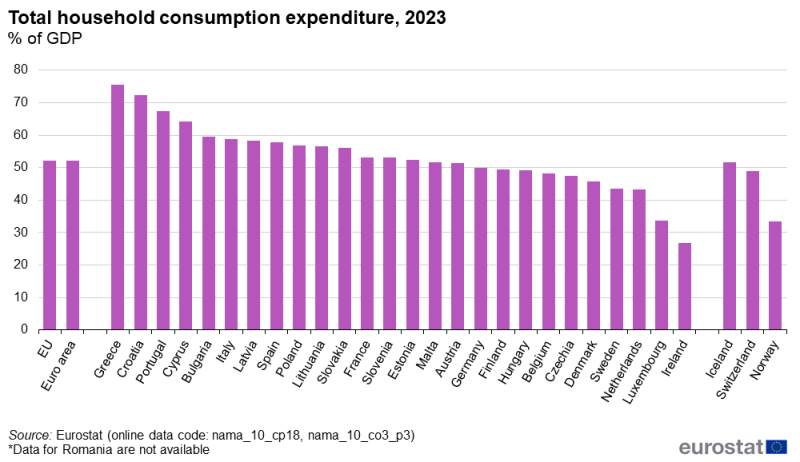 Now, shifting our focus to the consumption part of the EU growth story, it is weak at around 51% for the Euro Area and around 52% for EU. Of course, here again there are country-specific variations, but not that significant. If you look at the laggards in consumer spending, these are mostly Northern European countries including Germany as well as Hungary and the Czech Republic, where household spending is around 50% or less as a share of GDP. I have been reading in The Economist and elsewhere for years that Germany is weak on consumption as well as investment (especially on infrastructure), even when it was the largest and strongest economy in Europe. Where is all the large current account surplus accruing to Germany on strong trade, being put to use, one wonders.