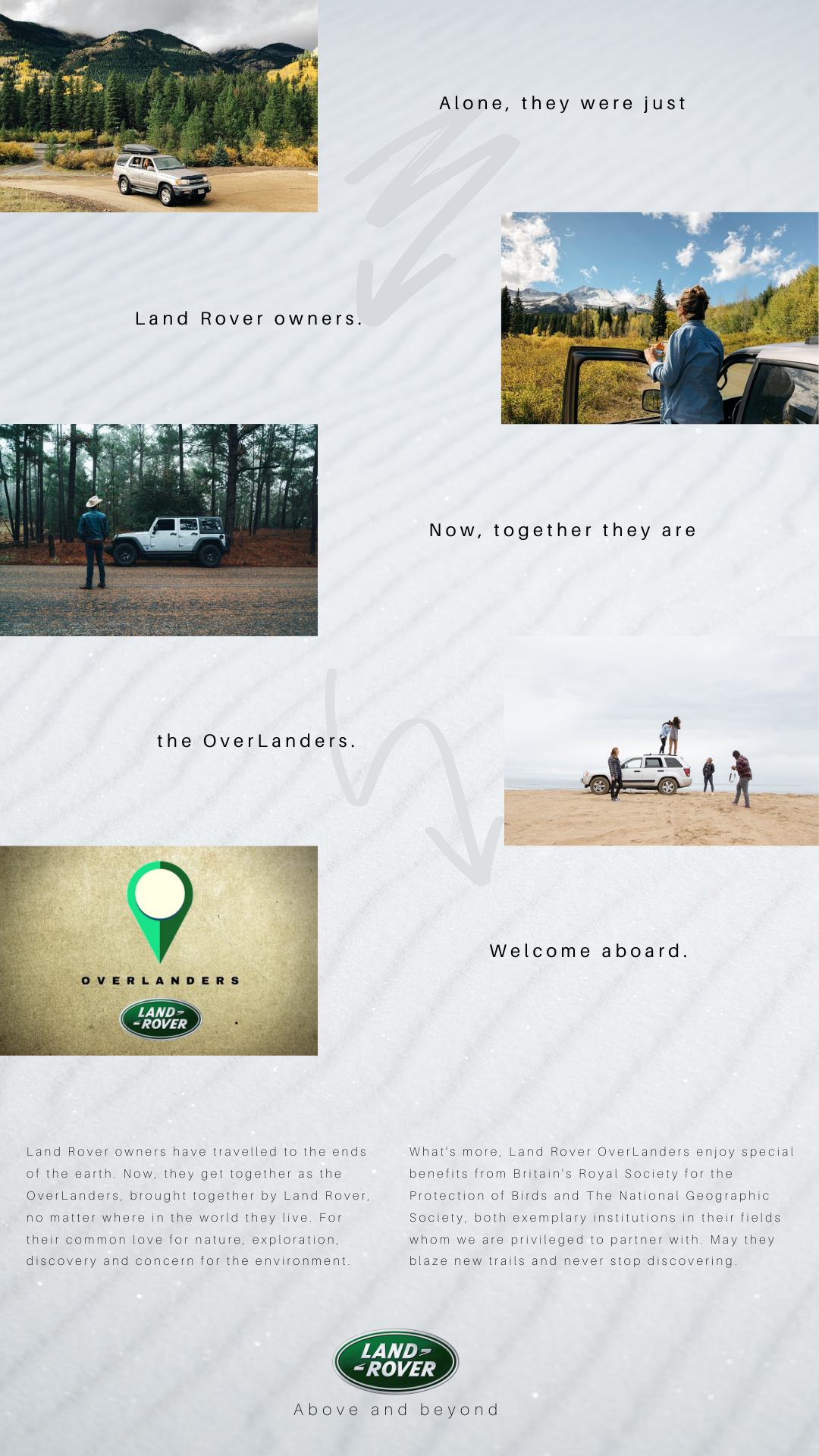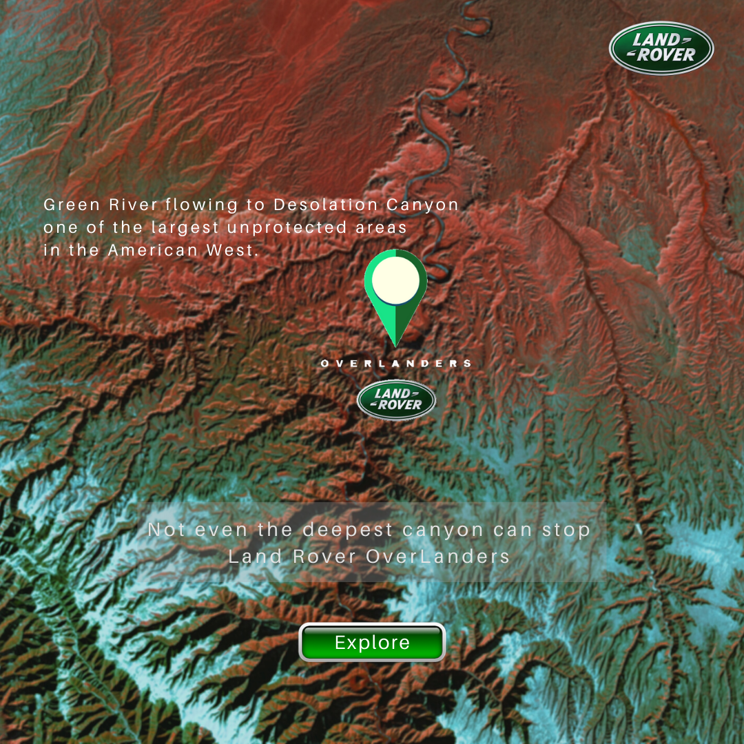 The idea in this campaign is to use maps and the Land Rover OverLanders location icon logo to communicate the arduous and far-out journeys that Land Rover owners undertake. This campaign uses USGS (United States Geological Survey) satellite images from Unsplash which add drama and a sense of wonder to Land Rover OverLanders’ journeys.