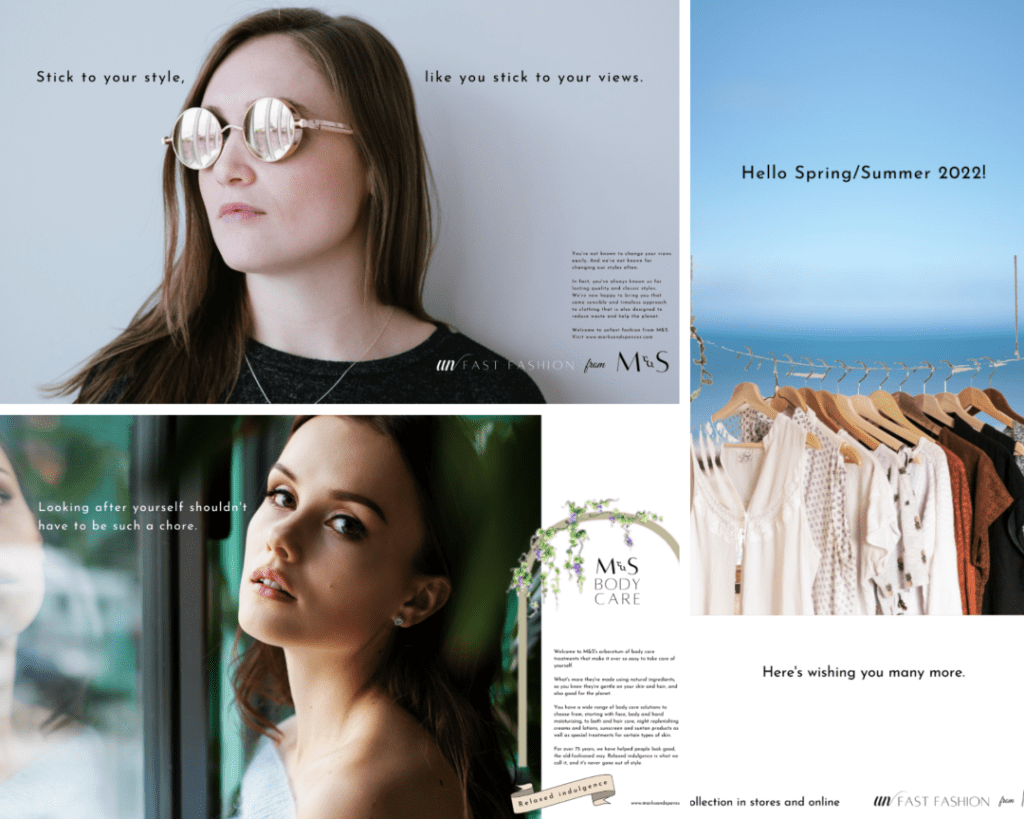 Since I am recommending that M&S fashion position itself as unfast fashion, the TV adverts focus on the elegant, timeless styles and emotional values around clothes. I couldn’t possibly have made the films for M&S unfast fashion using stock footage, and have left them as scripts in the document above.